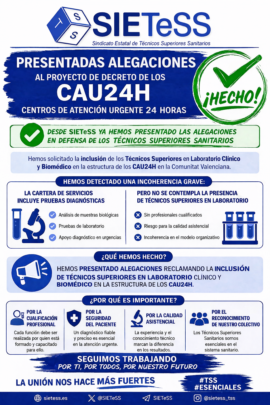 Una vez más, nos encontramos ante una situación que consideramos inaceptable: se contemplan pruebas de laboratorio dentro de estos dispositivos asistenciales, pero no se garantiza la presencia de los profesionales cualificados para realizarlas, los Técnicos Superiores en Laboratorio Clínico y Biomédico.