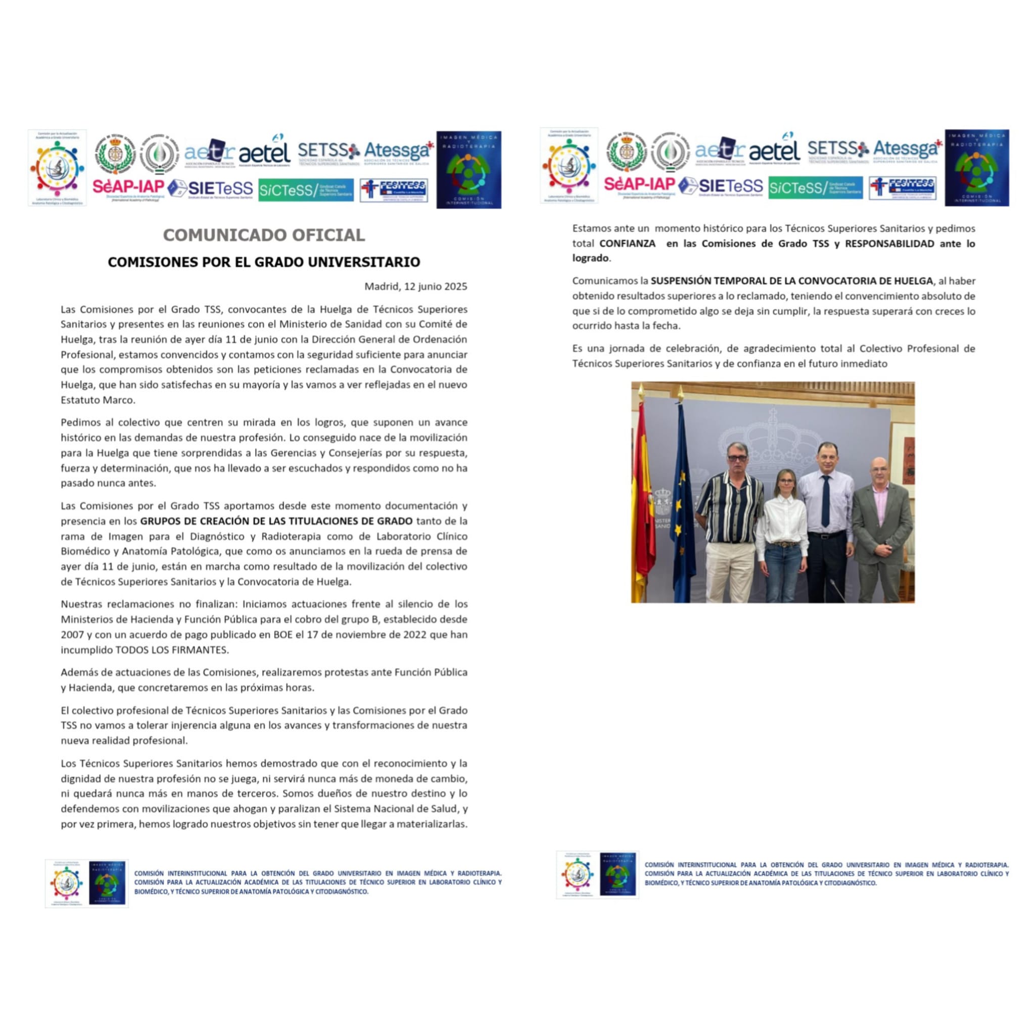 Las Comisiones por el Grado TSS, convocantes de la Huelga de Técnicos Superiores Sanitarios y presentes en las reuniones con el Ministerio de Sanidad con su Comité de Huelga, tras la reunión de ayer día 11 de junio con la Dirección General de Ordenación Profesional, estamos convencidos y contamos con la seguridad suficiente para anunciar que los compromisos obtenidos son las peticiones reclamadas en la Convocatoria de Huelga, que han sido satisfechas en su mayoría y las vamos a ver reflejadas en el nuevo Estatuto Marco.